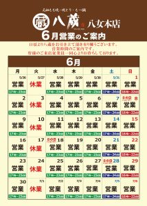 八蔵「6月営業時間のご案内」