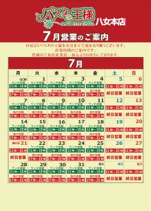 パスタの王様「7月営業時間のご案内」