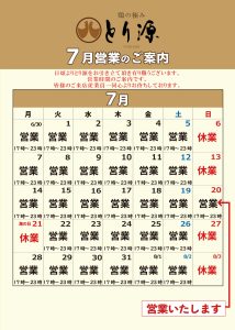 とり源「7月営業時間のご案内」