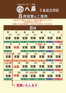 居酒屋八蔵「8月営業時間のご案内」