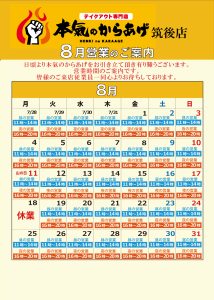 本氣のからあげ「8月営業時間のご案内」