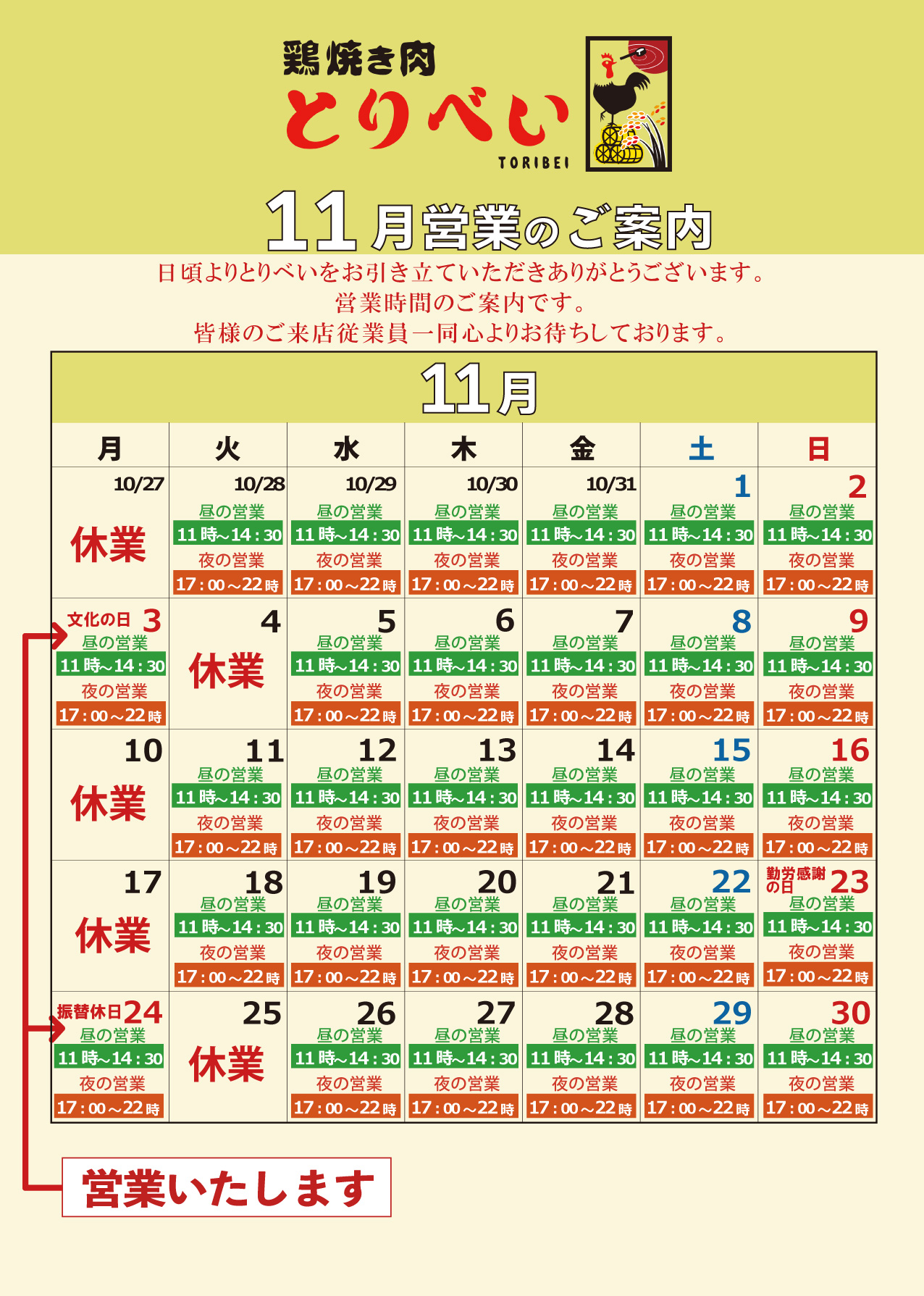 鶏焼き肉とりべい「11月営業時間のご案内」