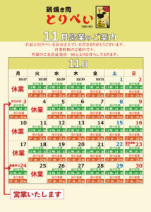鶏焼き肉とりべい「11月営業時間のご案内」