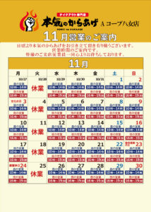 本氣のからあげ「11月営業時間のご案内」