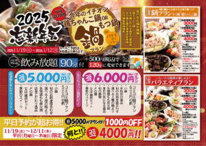 居酒屋八蔵11/19~「2025忘新年会宴会プランのご案内」