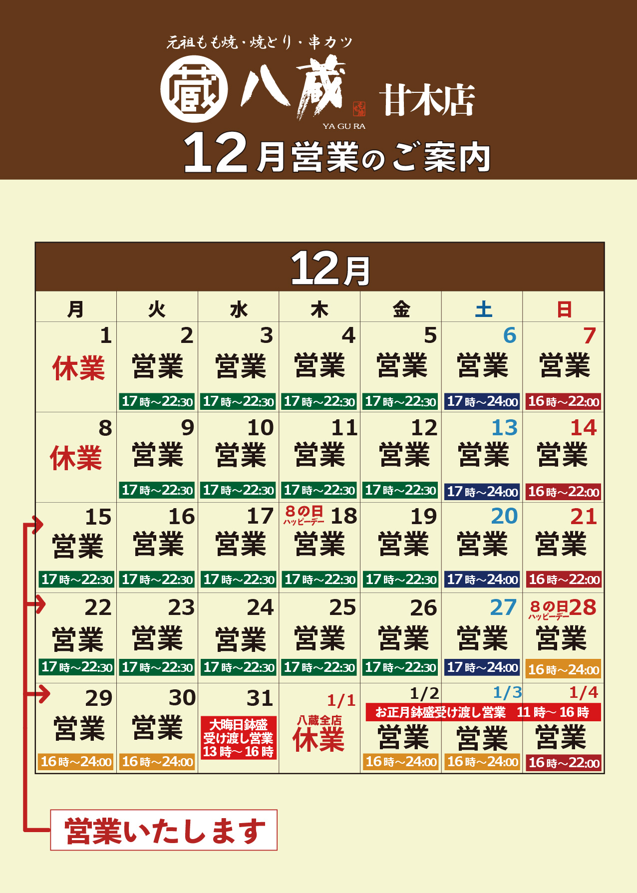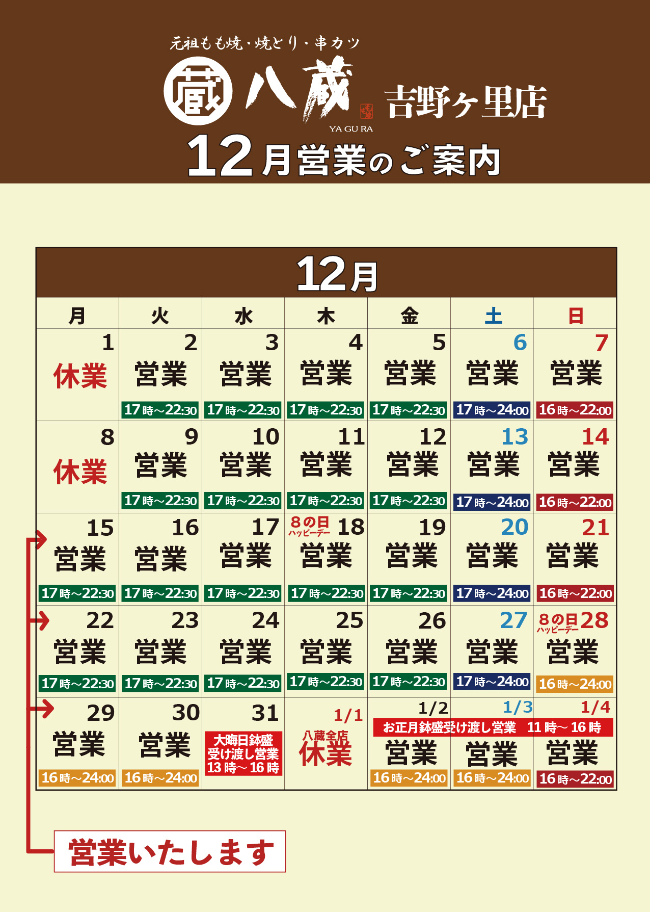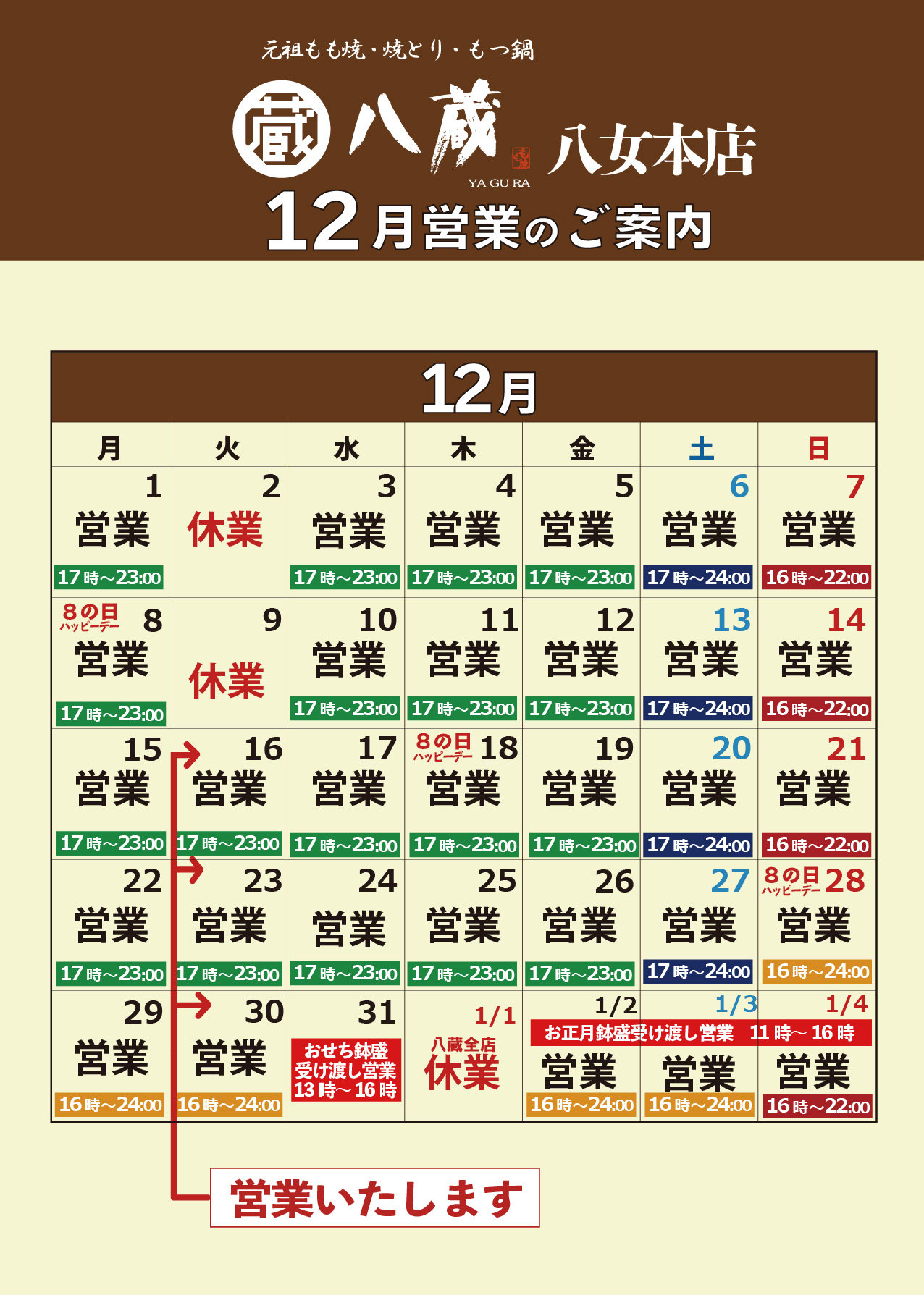 2025.12.03居酒屋八蔵「12月営業日のご案内」