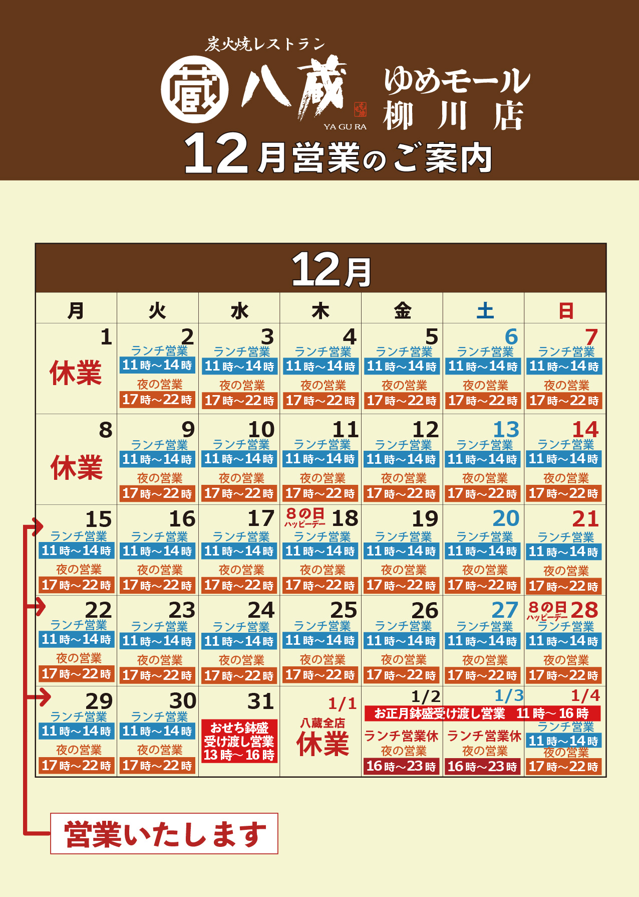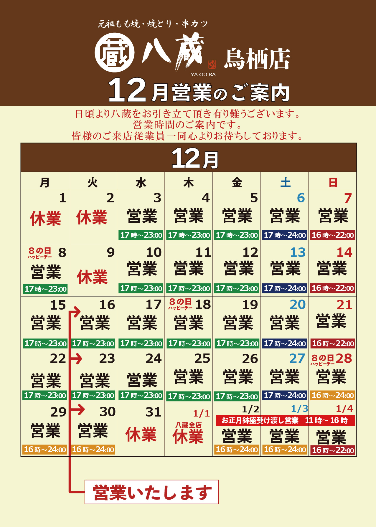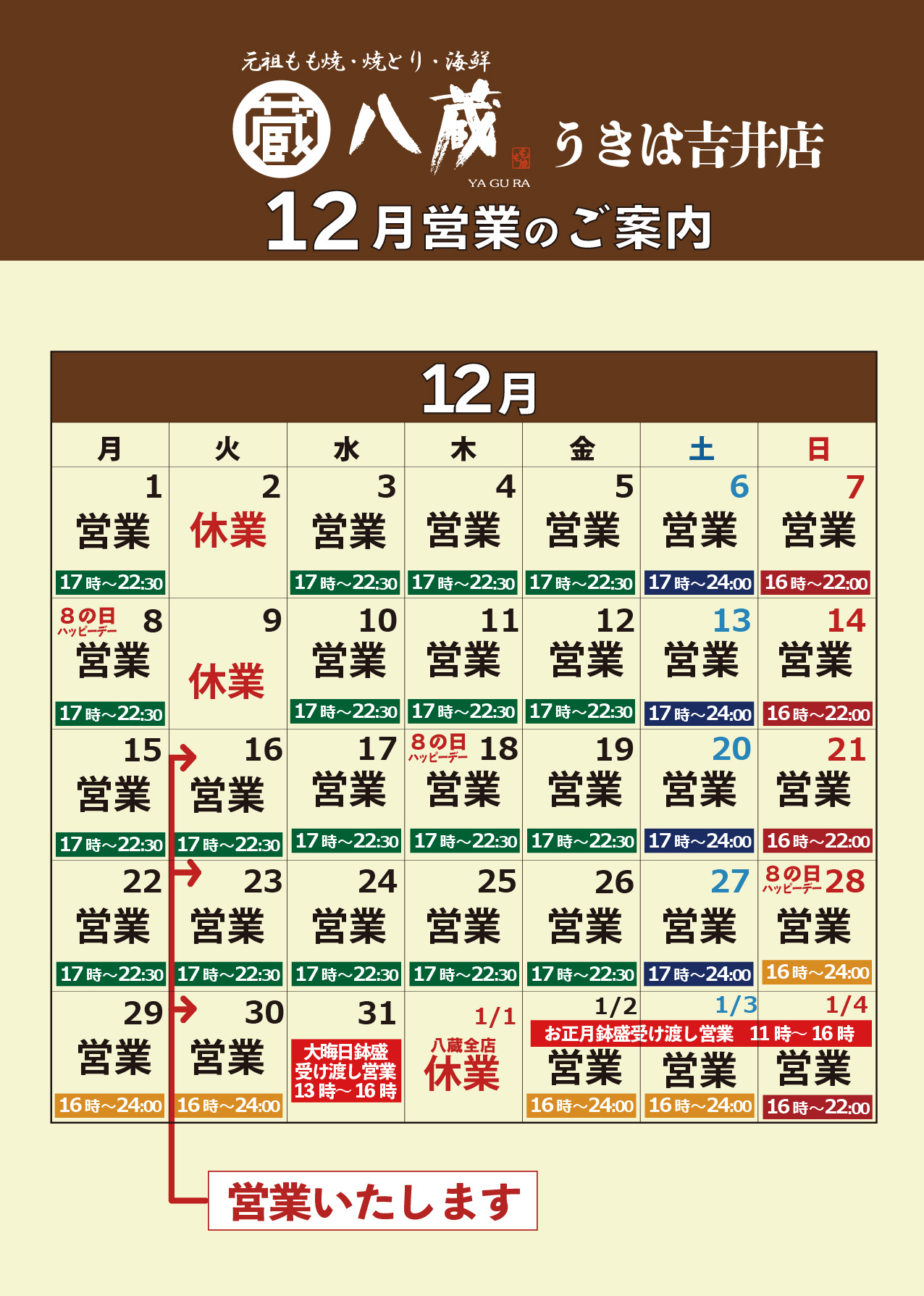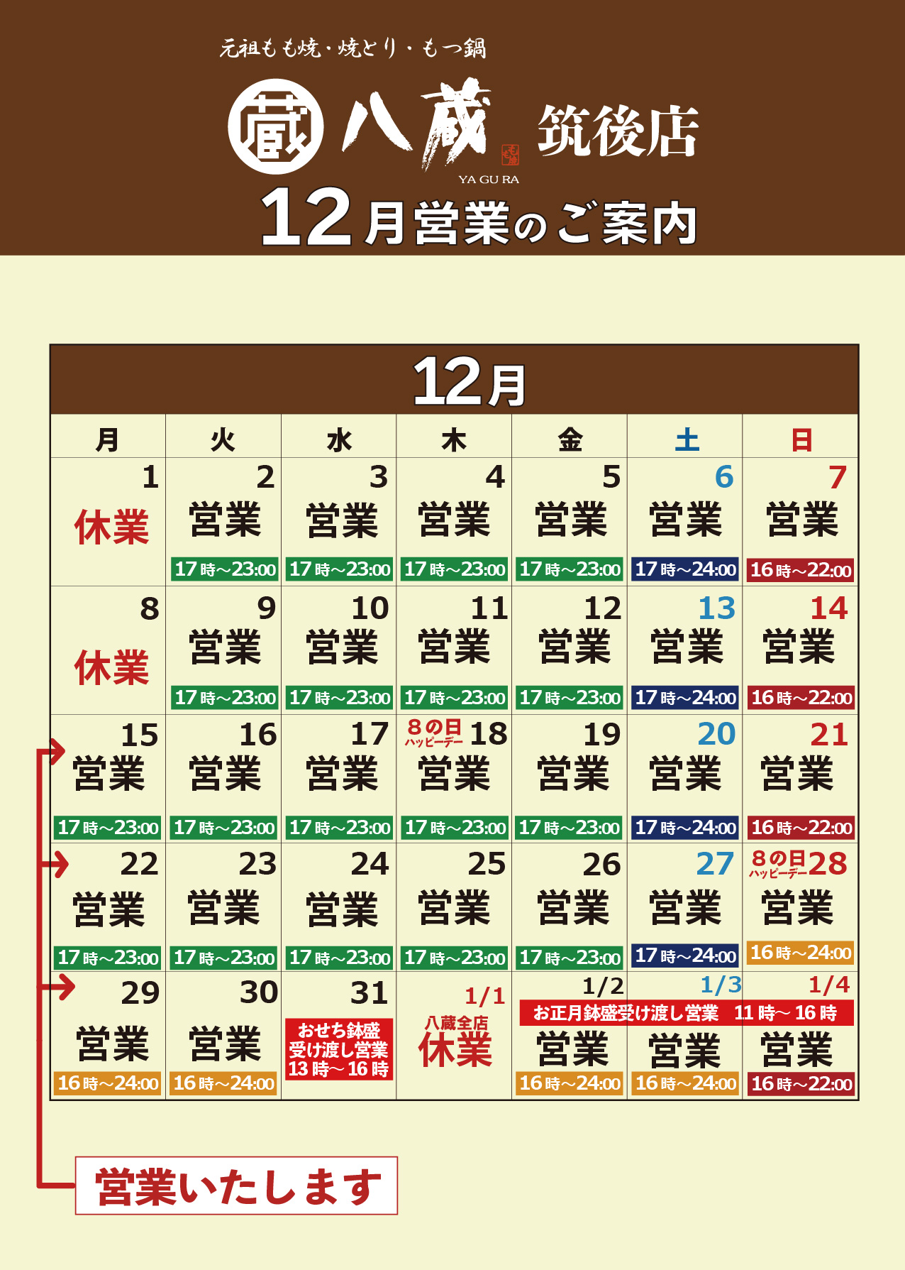 2025.12.03居酒屋八蔵「12月営業日のご案内」